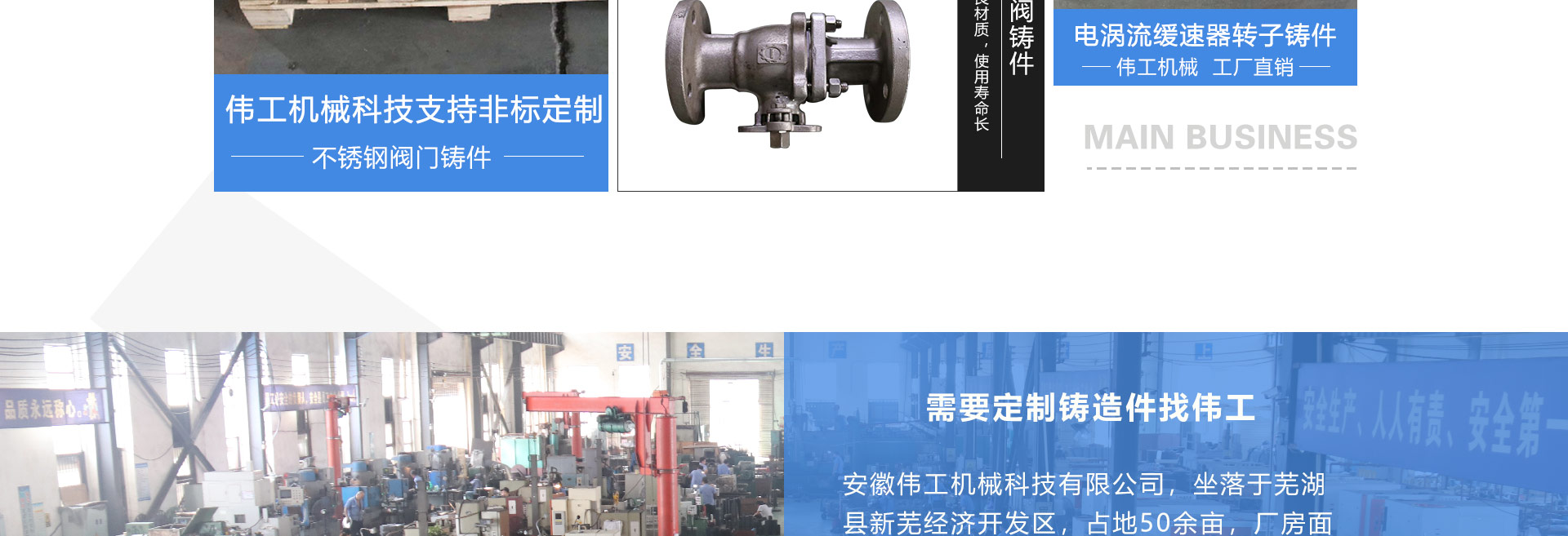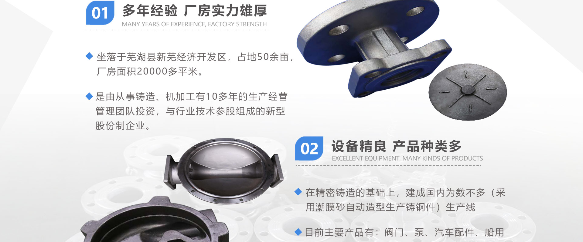 安徽偉工機(jī)械科技有限公司,坐落于安徽蕪湖新蕪經(jīng)濟(jì)開發(fā)區(qū),是一家専業(yè)從事鑄造產(chǎn)品設(shè)計(jì)、研發(fā)、生產(chǎn)、銷售于一體的企業(yè),公司為客戶的產(chǎn)品提供多樣的技術(shù)支持與設(shè)計(jì),公司主要鑄造技術(shù)有潮模砂鑄造、硅溶膠精鑄工藝。主要產(chǎn)品有:不銹鋼閥門配件、泵閥配件、汽車配件、工業(yè)管道配件、工程機(jī)械配件、汽車配件等。材質(zhì)為:低合金鋼、304、316、316L、鉻鉬鋼、哈氏合金、碳鋼、雙相鋼等。公司已先后通過ISO9001和TS16949等多種體系審核,以完備的管理手段和齊全的檢測(cè)設(shè)備滿足客戶需求,進(jìn)的設(shè)備,専業(yè)的技術(shù),嚴(yán)謹(jǐn)?shù)墓芾?,穩(wěn)定的質(zhì)量。服務(wù)客戶,鑄造未來,偉工誠(chéng)摯的歡迎新老客戶共同商洽合作